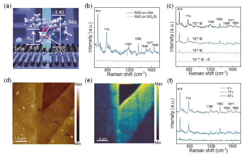 二維InSe具有原子級(jí)平整界面和高表面活性,有利于探針?lè)肿拥奈?,為?shí)現(xiàn)電荷轉(zhuǎn)移機(jī)制SERS提供了有力條件。InSe表現(xiàn)出優(yōu)秀的SERS性能,能夠?qū)崿F(xiàn)對(duì)R6G探針?lè)肿永盘?hào)的有效增強(qiáng),最低檢測(cè)濃度可達(dá)10-10 mol/L。吸附在2D InSe表面上的探針?lè)肿釉诠庹障掳l(fā)生光誘導(dǎo)電荷轉(zhuǎn)移。這種電荷轉(zhuǎn)移改變了分子極化率,增加了探針?lè)肿拥睦⑸浣孛?,從而放大了拉曼信?hào)。