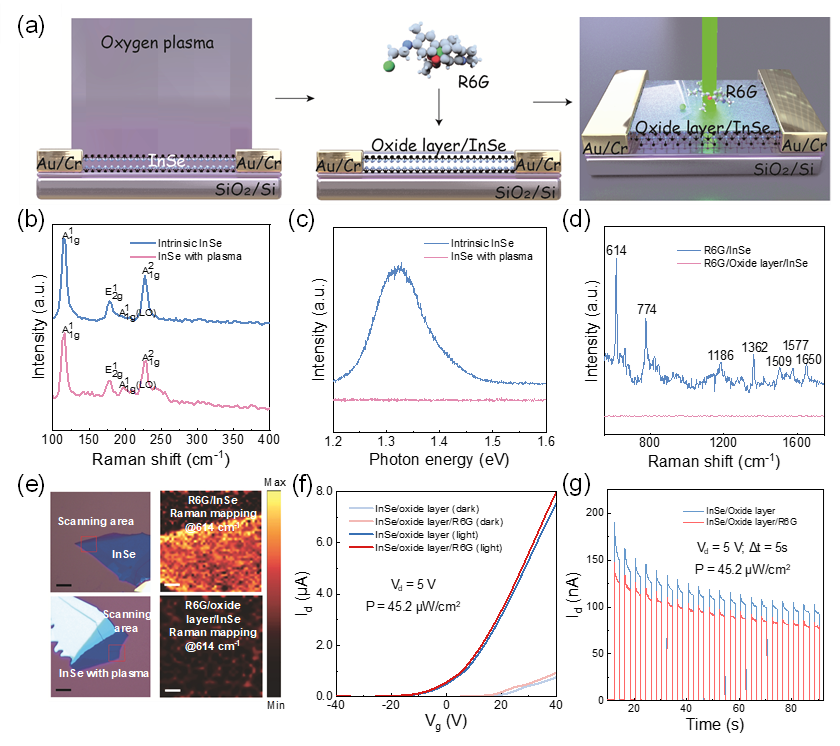 為進(jìn)一步驗(yàn)證電荷轉(zhuǎn)移機(jī)制,團(tuán)隊(duì)采用溫和氧等離子體處理的方式在InSe表面誘導(dǎo)了超薄自限氧化層,用于隔絕電荷轉(zhuǎn)移通路。這種方式引入的氧化層可以最大限度減少實(shí)驗(yàn)過(guò)程對(duì)材料本身的影響。氧化層引入之后,用R6G摻雜氧化層/InSe表面,發(fā)現(xiàn)有氧化層覆蓋的InSe表面無(wú)法檢測(cè)到R6G的拉曼特征峰。此外,引入氧化層之后的InSe器件在R6G摻雜前后表現(xiàn)出幾乎相同的光電響應(yīng),說(shuō)明R6G與InSe之間的電荷轉(zhuǎn)移通路被氧化層阻擋,進(jìn)而從光譜學(xué)和電學(xué)的角度證明了R6G與InSe之間的電荷轉(zhuǎn)移機(jī)制。