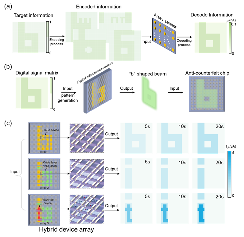 通過(guò)人為的引入噪聲,可以對(duì)需要隱藏的信息進(jìn)行加密處理。通過(guò)引入背景噪聲,可將真實(shí)信息隱藏在多張具有噪聲背景的圖像中。利用混合結(jié)構(gòu)器件的圖像降噪功能,將被噪聲背景隱藏的真實(shí)信息解密。根據(jù)解密得到的特定形狀的數(shù)值矩陣,生成特定形狀(字母“b”)的光束用于防偽陣列的驗(yàn)證。通過(guò)表面處理技術(shù),可以對(duì)R6G/InSe混合結(jié)構(gòu)器件中的電荷轉(zhuǎn)移過(guò)程進(jìn)行調(diào)控,使得器件對(duì)相同光刺激產(chǎn)生不同的光響應(yīng)。利用這一特點(diǎn),團(tuán)隊(duì)設(shè)計(jì)了加密防偽陣列。陣列中包含了精心設(shè)計(jì)的三種類(lèi)型的InSe器件(純InSe器件,R6G/InSe器件以及氧化層/InSe器件)組成特定的圖案。由于器件之間光響應(yīng)及突觸性能的差異,當(dāng)用于驗(yàn)證芯片真?zhèn)蔚摹癰”形光束照射到陣列表面時(shí),正版芯片會(huì)顯示出字母“i”或字母“i,t”。而盜版芯片由于沒(méi)有表面處理,僅能顯示出字母“b”。團(tuán)隊(duì)提出的應(yīng)用方案,通過(guò)編碼的檢測(cè)光束形狀和芯片設(shè)計(jì)實(shí)現(xiàn)雙重加密,在片上防偽方面顯示出廣闊的應(yīng)用前景。在實(shí)際應(yīng)用中,R6G的摻雜濃度可作為一個(gè)額外的調(diào)控參數(shù),提供獨(dú)特的指紋信息,進(jìn)一步提升設(shè)計(jì)芯片的防偽安全性。
