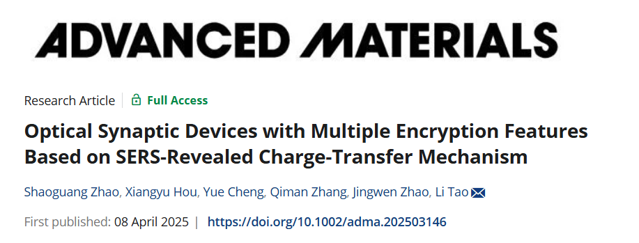 近日,北京理工大學(xué)物理學(xué)院姚裕貴教授團(tuán)隊(duì)成員陶立教授課題組在A(yíng)dvanced Materials發(fā)表了一項(xiàng)重要研究成果,題為“Optical synaptic devices with multiple encryption features based on SERS-revealed charge-transfer mechanism”。具有原子級(jí)厚度的二維材料光學(xué)突觸器件表現(xiàn)出構(gòu)建高度集成的可調(diào)諧人工視覺(jué)神經(jīng)網(wǎng)絡(luò)的潛力。然而,原子級(jí)厚度也會(huì)導(dǎo)致光吸收較弱,限制了器件的光電性能。該研究提出的羅丹明6G染料(R6G)/InSe雜化結(jié)構(gòu)器件展現(xiàn)了優(yōu)異的光響應(yīng)及光電突觸性質(zhì),并從光譜學(xué)和光電子器件兩種視角,證明了染料分子和二維InSe之間的電荷轉(zhuǎn)移機(jī)制。通過(guò)表面處理有效調(diào)控了電荷轉(zhuǎn)移的過(guò)程,并基于此實(shí)現(xiàn)了雙重光學(xué)加密防偽應(yīng)用。