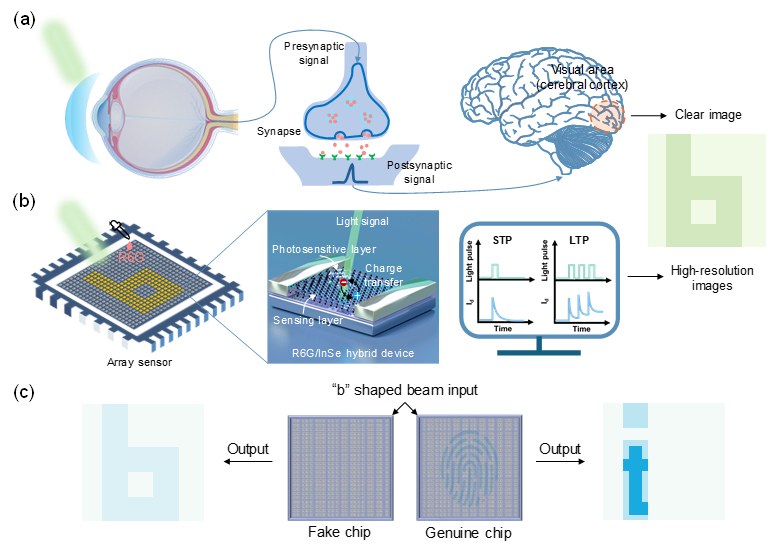 陶立教授等人此前在國(guó)際上率先發(fā)現(xiàn)高態(tài)密度二維半金屬材料(如1T′相WTe2、MoTe2)對(duì)染料分子具有極強(qiáng)的無(wú)等離激元電荷轉(zhuǎn)移機(jī)制的表面增強(qiáng)拉曼散射(SERS)效應(yīng)[J. Am. Chem. Soc. 2018, 140, 8696; Cell Rep. Phys. Sci. 2021, 2, 100526],引起對(duì)類(lèi)似材料SERS研究的熱潮。例如,香港城市大學(xué)張華教授等人利用濕化學(xué)法制備了高相純度的多種1T′ TMD材料,并解決了通常1T′相材料的穩(wěn)定性問(wèn)題,展示了此類(lèi)材料對(duì)染料及新冠病毒刺突蛋白的優(yōu)異SERS效應(yīng),推進(jìn)了此研究領(lǐng)域向?qū)嵱没~進(jìn)[Nat. Mater. 2024, 23, 1355; Chem. Rev. 2024, 124, 4479]。然而,在光電子器件中,因載流子濃度難以被調(diào)控,二維半金屬并不是理想的溝道材料候選者。在這項(xiàng)工作中,研究團(tuán)隊(duì)采用具有高載流子遷移率及高態(tài)密度的半導(dǎo)體型二維InSe材料作為器件溝道,染料分子R6G作為溝道敏化劑,使得混合結(jié)構(gòu)(R6G/InSe)同時(shí)具有良好的SERS及光電子學(xué)性能。研究團(tuán)隊(duì)利用SERS這種非破壞性光譜探測(cè)技術(shù),證明了R6G和InSe之間的電荷轉(zhuǎn)移是實(shí)現(xiàn)該器件高性能的關(guān)鍵機(jī)制。此外,團(tuán)隊(duì)通過(guò)氧等離子體界面工程技術(shù),在InSe表面引入了超薄自限氧化層。自限氧化層阻擋了電荷轉(zhuǎn)移通路,使得器件在光譜學(xué)和光電性能上表現(xiàn)出明顯差異,這為電荷轉(zhuǎn)移過(guò)程提供了更詳細(xì)的證據(jù)。這種光學(xué)突觸器件中的電荷轉(zhuǎn)移過(guò)程充分模擬了生物突觸中神經(jīng)遞質(zhì)的傳遞過(guò)程,并在人工神經(jīng)網(wǎng)絡(luò)中的圖像預(yù)處理和解碼等應(yīng)用中顯示出獨(dú)特的潛力。通過(guò)表面處理技術(shù),團(tuán)隊(duì)對(duì)電荷轉(zhuǎn)移過(guò)程進(jìn)行了精確調(diào)控,實(shí)現(xiàn)了基于多重加密的防偽陣列的設(shè)計(jì),突出了這種雜化器件在片上防偽中的應(yīng)用價(jià)值。該工作創(chuàng)造性地開(kāi)展了SERS和光電突觸器件領(lǐng)域的交叉學(xué)科研究,通過(guò)無(wú)損光譜檢測(cè)技術(shù)來(lái)探測(cè)電荷轉(zhuǎn)移,闡明了電荷轉(zhuǎn)移在光學(xué)突觸器件中的關(guān)鍵作用,并開(kāi)辟了新的應(yīng)用途徑。